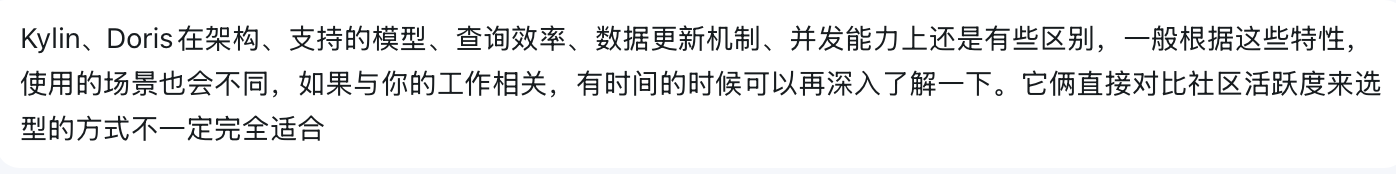 当时我只是整合 kylin 到系统里,说真的就是只是做了做安装和部署,我只是大约了解了 cube,kylin 是维度聚合什么的,只能扯东扯西,最后说到 doris 社区很火热,kylin 社区比较“冷”,截止今日,我去 github 看了看,(吔,竟然在 25.12.2 号竟然有新的提交,打脸了),不过活动的确是比较少了,更多是维护。我说到这生硬结尾了。