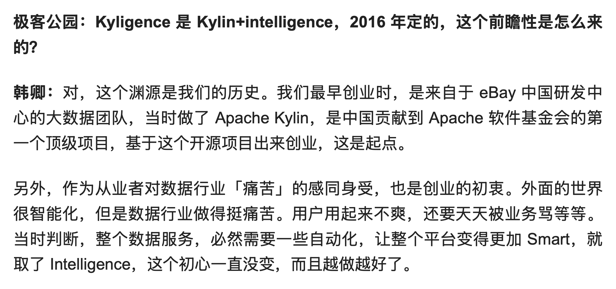 来到 kyligence 官网,观察韩大哥开了快十年的公司,发现他们主要售卖两个服务,一个是基于 kylin 的数据中台服务,另一个是AI 赋能数据服务,说出来可能不信,韩大哥是有远见的,如果 gpt 爆发的 23 年算是AI 元年的话,其实早到19 年,kyligence 就有推出过 AI 增强引擎,因为整个数据链路是麻烦的痛苦的,天天挨业务方骂的,韩大哥很早就想给数据服务 AI 赋能了,这里顺便收回前面的关子,为啥叫 kyligence 呢?拆开看,就是 kylin+intelligent,麒麟加智能,韩大哥的远见,16 年就已经看出。