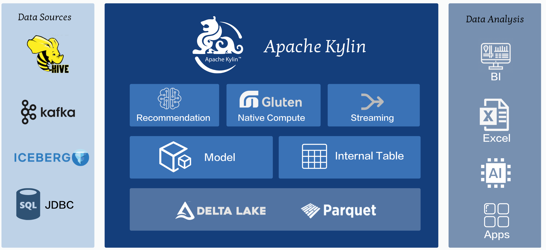 可以看出,Kylin 位于数据源与 BI 分析之间,作为 OLAP 计算引擎: