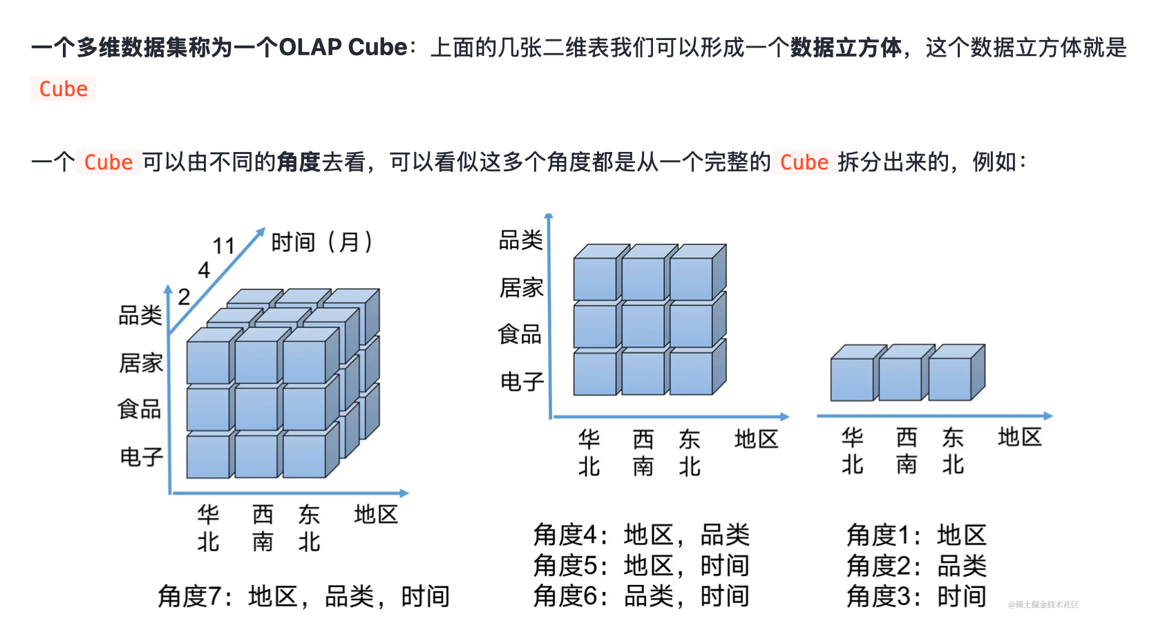 假设有三个维度,你看可以凑出八个(不是七个吗?但其实我什么维度都没有,也算一个呀小老弟)角度来预聚合数据,当业务要求 x 地区 y 品类的数据时,我们直接拿取角度 4cube 预聚合的数据,再也不用苦苦等待了!