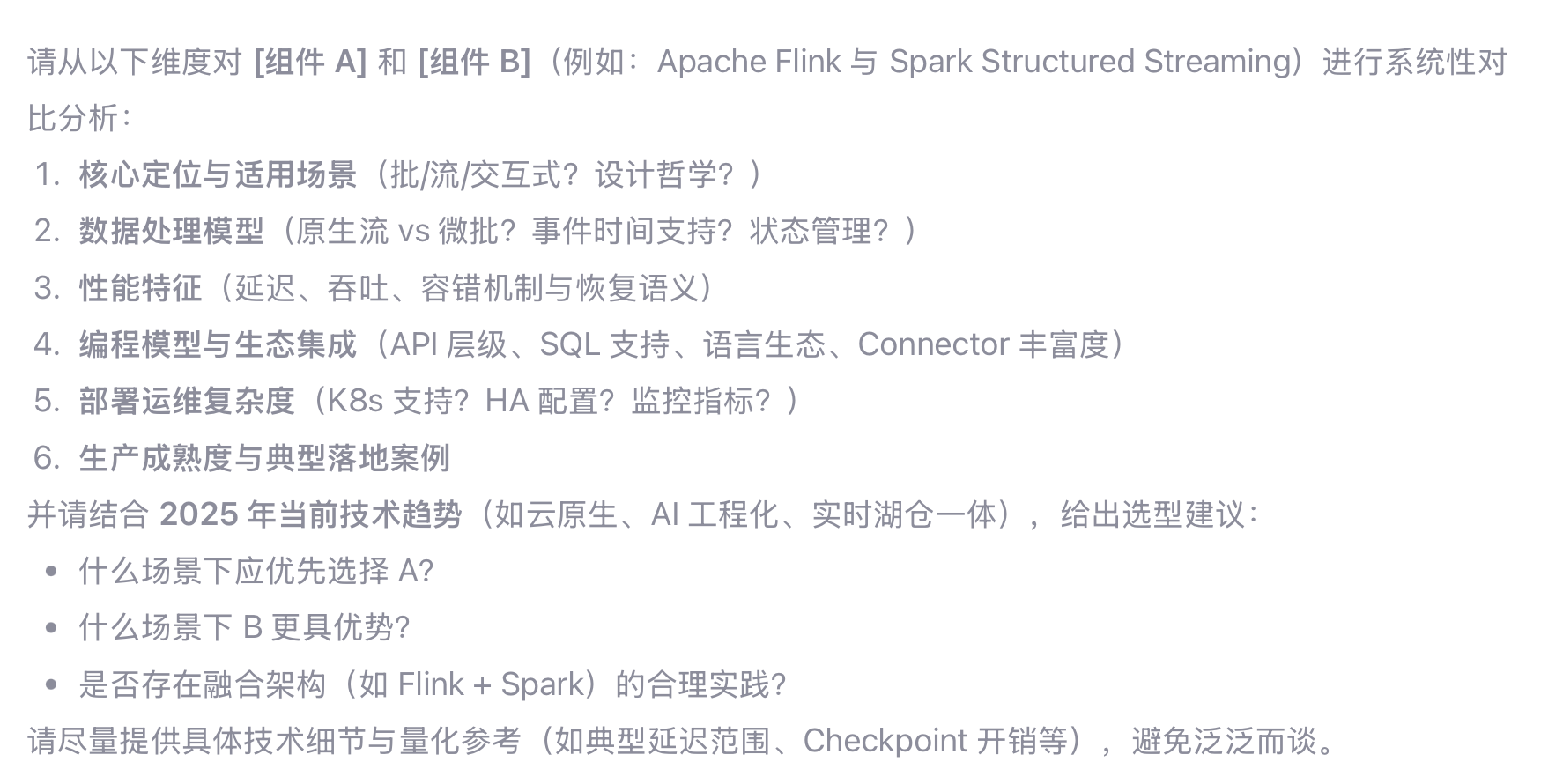 但是还是扯回来,我还是拿这两个组件打一下八角笼,我个人是偏爱 doris,有失偏颇,我直接问 AI 来给大家看结果,我首先问 AI 两个大数据组件进行比拼,要从哪几个方面比较,然后按照这个我分别问 openai,gemini,qwen,DeepSeek,豆包,kimi,然后要求他们综合下来给二者其中一票,绝对公平公正