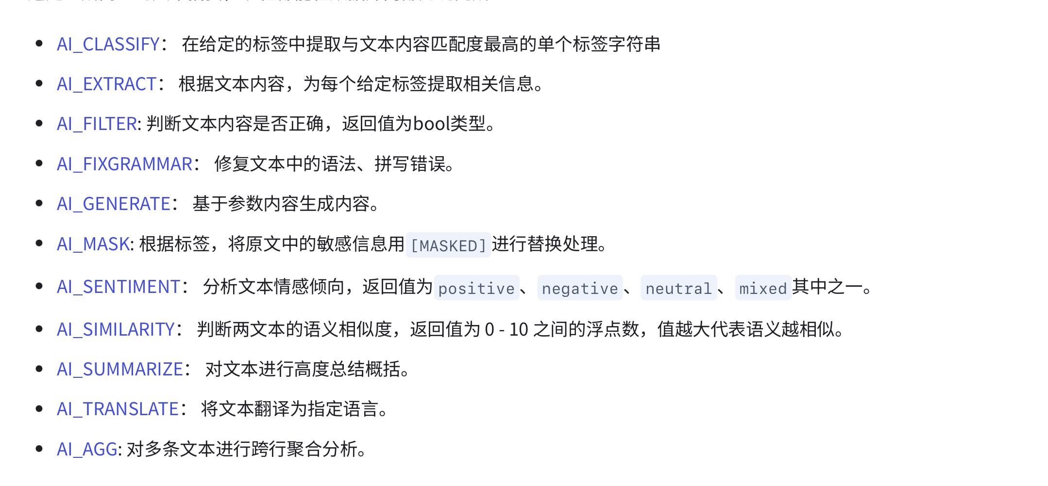 日后会不会 kylin 又有神更新,让他在 hadoop 的体系下使得焕发第二春?我不得而知,现在让我在结尾前中断一下,还记得我在前面说的,doris4 有一个让我觉得很有意思的更新的点吗?现在先回收这点,doris 在 4.0版本,引入了 AI 函数库,没错,就是你写 sql 顺便调用 AI 帮你分析,官方文档在 4.0.0 Release 文档是这么说的: